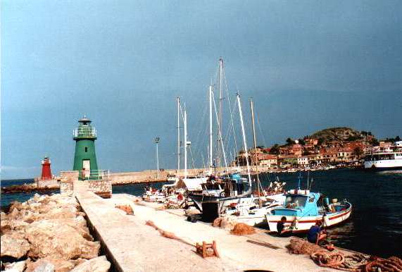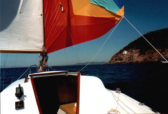 Morgens habe ich zum Einkaufen kurz im Stadthafen festgemacht. Abgelegt habe ich dann unter Segeln, was in dem leeren Hafen kein Problem ist. Danach bin ich bei maximal 2 Bf nach Cavo gesegelt. Für die 8 sm habe ich volle 5 Stunden gebraucht - ohne Autopilot hätte ich sicher bald den Motor gestartet.