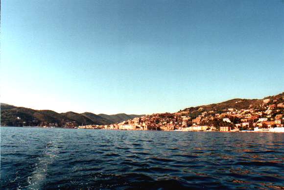 Um halb Zehn bin ich ich bei Flaute und flacher See ausgelaufen, um nicht zu spät nach Elba zu kommen. Nach 1,5h und 7 sm unter Motor konnte ich die restlichen 26 sm nach Elba bei 2-4 Bf unter Genua und Groß segeln. Um halb sechs Abends habe ich dann (mal wieder) in Marciana Marina festgemacht. Im Hafen habe ich wieder nette Bekanntschaften gemacht und andere Segler erneut getroffen. Auffällig im Hafen war diesmal eine große, dunkel gestrichene Stahlyacht aus Papete, mit der eine ganze Familie unterwegs war. Das Boot hat recht rustikal ausgesehen, z.B. war der Niedergang mit Vorhängeschloß und Kette abgeschloßen ...
